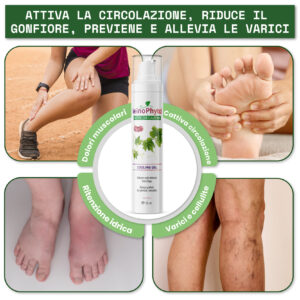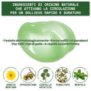 FORMULA NATURALE PER UNA CIRCOLAZIONE OTTIMALE: progettato per stimolare la circolazione e migliorare la sensazione di leggerezza di gambe e piedi, questo gel è il complemento perfetto per le capsule di Veinophytol Pro, potenziandone l’effetto lenitivo.