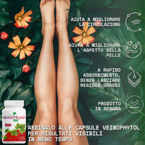 Il Veinophytol è un integratore alimentare basato su una combinazione di Bioflavonoidi (Diosmina, Rutina, Esperidina) e piante come il Ruscus e l'Ippocastano e polvere di Mango, Resveratrolo e Vitamina C.